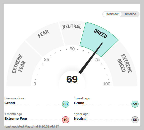 벌써 탐욕구간으로 올라왔는데 주식은 공포구간 이하에서 매수하는거 아시죠? 지금은 다시 상승의 신호가 오고 있으니 주가가 본인 평단보다 낮은 분들에 한해 일정부분 매수구간이라 할 수 있습니다.
