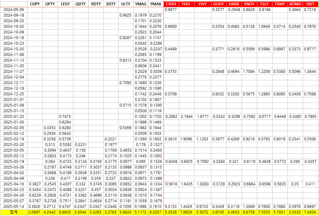 - ETF(CHPT, GPTY, LFGY, QDTY, SDTY ULTY, YMAG, YMAX)는 매주 배당을 지급하며, 나머지 ETF는 월간 배당입니다.