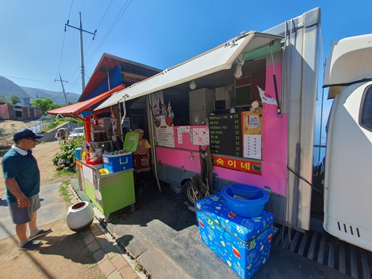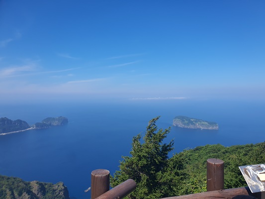 👉 내수전 일출 전망대에서 본 바다와 먼 섬들은 너무나도 멋이 있었어요. 전망대에 가기까지는 약 20분 정도 둘레길과 계단을 따라 올라가야하는데요. 중간에 시원한 마가목차와 호박식혜를 파는 곳이 있어 더운 날씨에 맛나게 먹었답니다.