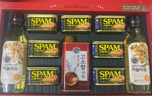 가장 무난하지만 호불호가 갈릴 수 있는 것은 선물세트입니다. 회사에 다니시는 분들은 선물세트가 일괄적으로 나오기도 하는데 구성을 보면 스팸, 식용유, 샴푸 등 필요한 생필품 위주로 되어 있습니다.