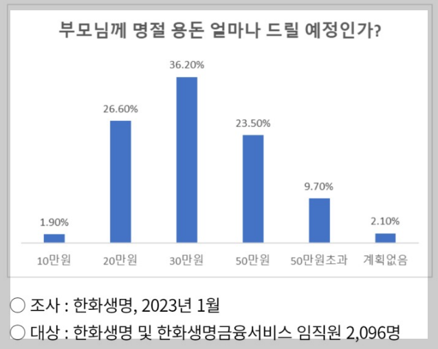 명절 부모님 용돈에 대한 조사를 한 적이 있습니다. 설문조사 내용과 같이 최소 20~30만원이 적당하다고 생각하는 것 같습니다. 개인당 20만 원 정도를 드린다고 가정했을 때 결혼을 했다면 양가 부모님께 모두 80만 원을 드리게 됩니다.