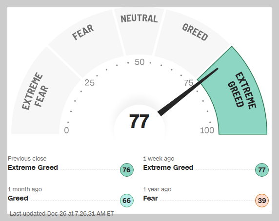 2023년 말인 12월 26일! CNN 공포탐욕지수는 77로서 극도의 탐욕구간으로 진입했군요. 산타랠리가 지속될까요? 아니면 다시 침체기가 올까요? 많은 전문가들이 2024년에는 FED의 금리인하, 주식시장 활성화, 비트코인의 떡상을 예상하고 있는데요. 미래는 아무도 모릅니다.😀