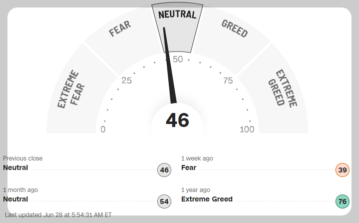 2024년 6월 28일 기준 공포탐욕지수는 46로 다시 중립구간을 가리키고 있어요. 며칠 전 반도체주를 중심으로 하락되었던 증시는 조금씩 반등의 신호를 보여주고 있지요.
