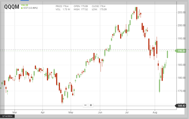 위의 차트는 2월 QQQM의 주가변화입니다. 1주 가격이 176.4(24년 2월 14일)이었는데 최근 하락 후 반등을 포함하더라도 190.38(24년 8월 14일)이군요. 약 7% 상승했습니다.
