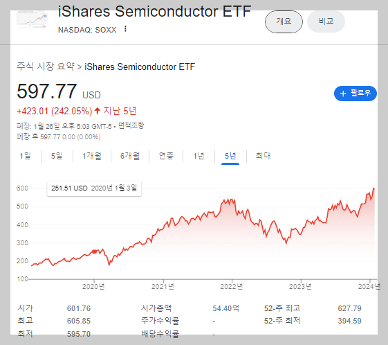 지난 5년간 2020년 코로나19와 2022년 반도체 감산으로 인한 한파에도 불구하고 2배 이상 올라 2024년 1월 27일 기준 주당 597달러(약 80만원)를 기록하고 있군요. 소액 투자자(개미) 입장에서는 1주의 가격도 부담스런 가격일 수 있겠네요.