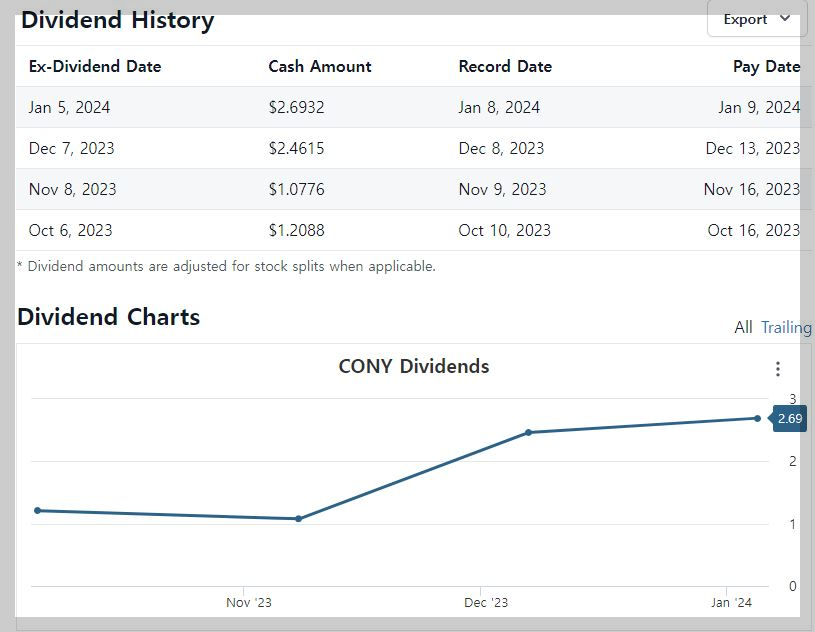 2023년의 기록을 보면 CONY도 1달러대의 배당을 주고 있었지만 코인베이스(COIN)의 주가상승으로 기초자산이 증가함에 따라 2달러대를 기록할 수 있었던 것으로 보입니다. 주가상승으로 당연 옵션거래량도 증가했기 때문에 많은 이익이 있었을 것으로 추측됩니다.