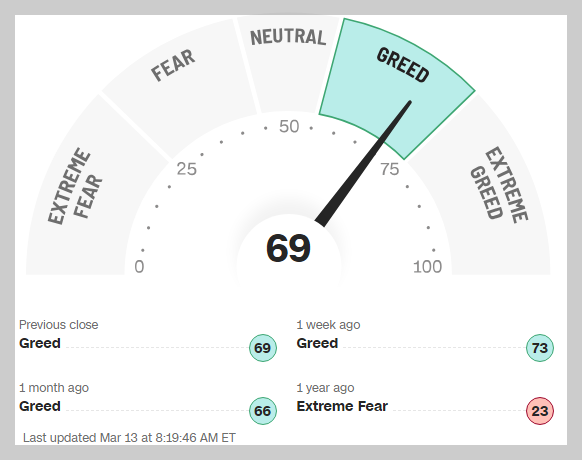 3월은 증시에 많은 변화가 있는 시기입니다. 연초부터 증시가 상승하면서 과열을 나타냈고 소비자물가지수(CPI)를 발표했죠. 따라서 현재 공포탐욕지수는 69을 나타내고 있습니다.