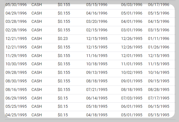 배당금은 계속 성장하고 있군요. 1995년 4월에는 1주당 0.15달러를 지급했으나 지금은 1주당 0.2555달러를 월배당으로 지급하고 있어요. 27년간 배당이 성장하면서 지급되었고 지난 10년간 배당성장률은 50%네요.