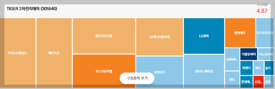 | TIGER 2차전지테마 | 미래에셋 | '18.9.12. | 52.66% | 34,285원 | 연 1회(5~70원) |