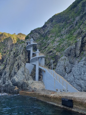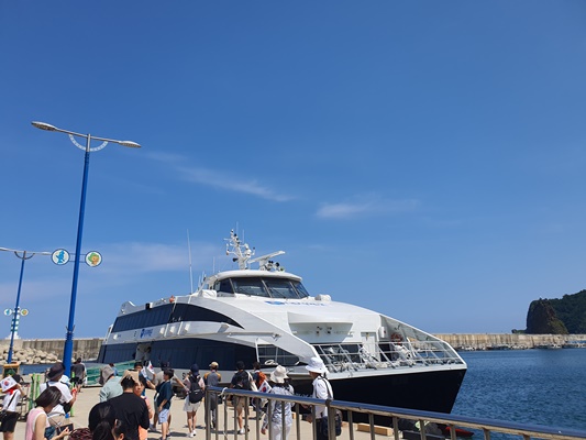 👉 죽도는 울릉도의 동북부에서 동쪽으로 약 2Km 떨어져 있고 저동항에서 가면 4.8Km 떨어져 있어요. 도동항에서 유람선을 타고 약 30분 정도 가면 도착해요. 도동여객선 터미널 입구 매표소에서 25,000원에 표를 구매하면 됩니다.(하루 2회 - 08:30 / 14:50)