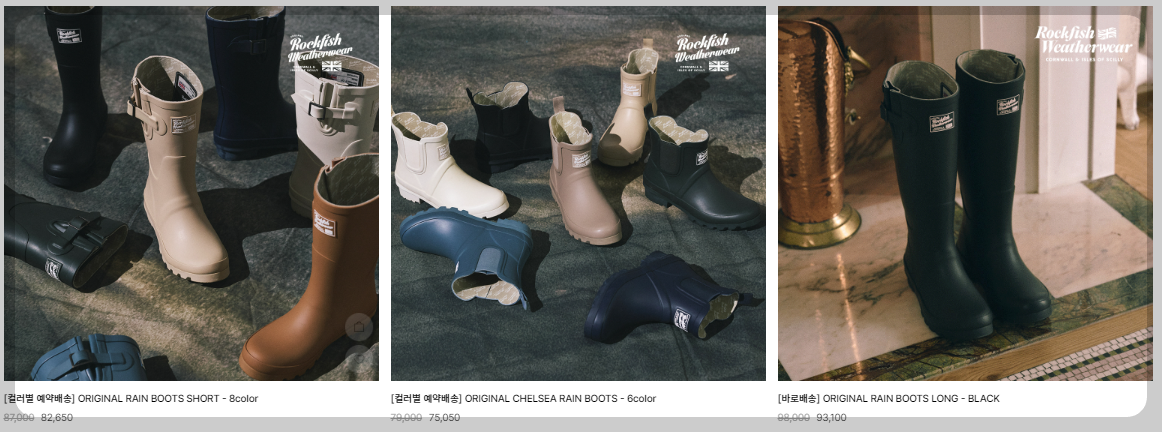 락피쉬(Rockfish) 역시 영국브랜드에요. 그러나 가격은 헌터의 절반정도이네요. 헌터를 보다가 락피쉬를 보니 그래도 저렴하게 느껴집니다만 10만원대 안팎으로 여전히 비싼 건 마찬가지죠.