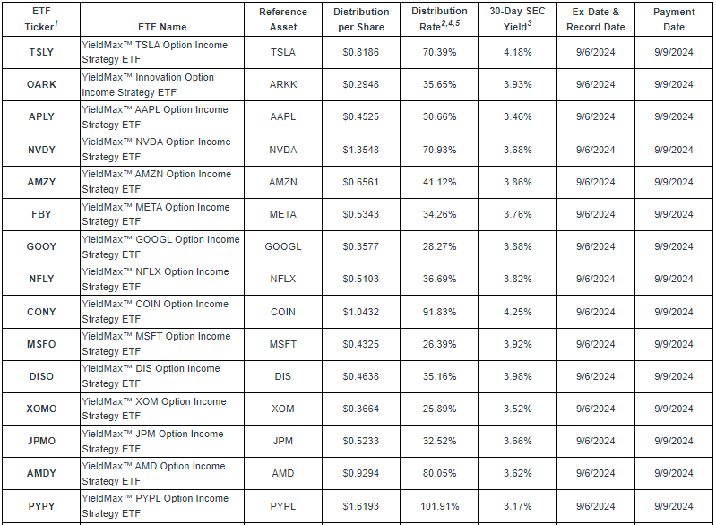 2024년 9월 TSLY, CONY, NVDY, MSTY 등 일드맥스 ETF 배당 발표