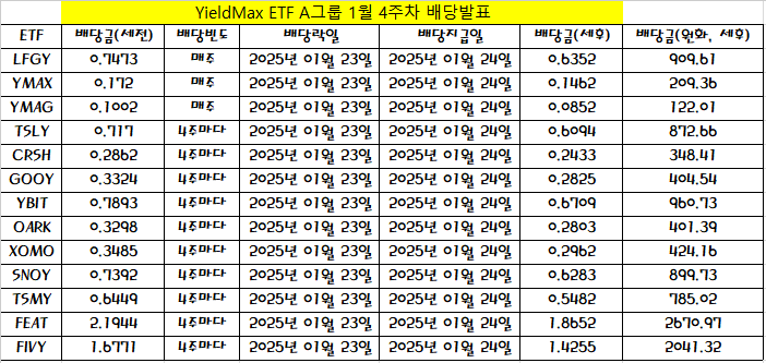 2025년 1월 4주차 일드맥스(YieldMax) ETF 배당(분배금)이 발표되었어요.