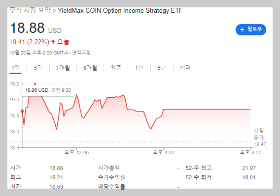 코인베이스(COIN)의 변동성과 콜 옵션을 활용하여 이익을 내고 분배금으로 나눠주는 전략을 사용하고 있는데요. 투자자 입장에서는 1주에 매달 1.2088달러가 나온다고 했을 때 15%의 세금을 제외하고 약 1달러를 분배금으로 받을 수 있게 됩니다.